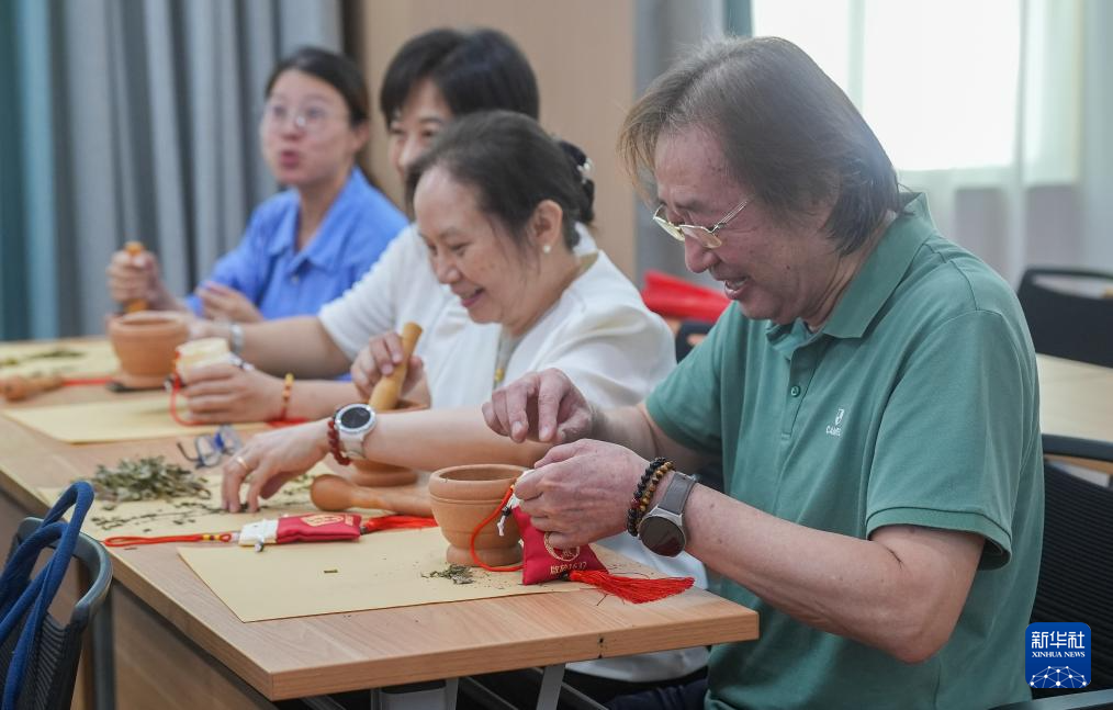 7月5日,在湖北省武汉市叶开泰中医药文化园,“海峡两岸媒体荆楚行”参访团成员体验制作香包。新华社记者 杜子璇 摄