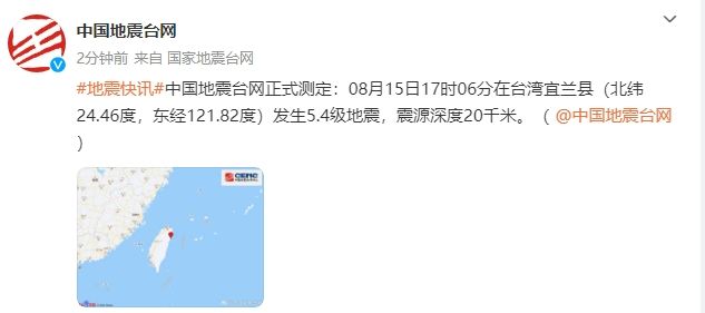 中国地震台网正式测定:8月15日17时6分在台湾宜兰县(北纬24.46度,东经121.82度)发生5.4级地震,震源深度20千米。