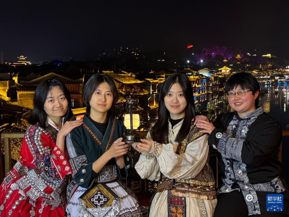 中华民族的历史文化多彩绚丽。在湖南湘西土家族苗族自治州,大陆少数民族的独特风情让台湾朋友深感新奇。夜幕降临,凤凰古城灯火璀璨,沱江两岸各式商铺鳞次栉比。21岁的台北商业大学学生杨乔羽在这里换上了一套苗族传统服饰。