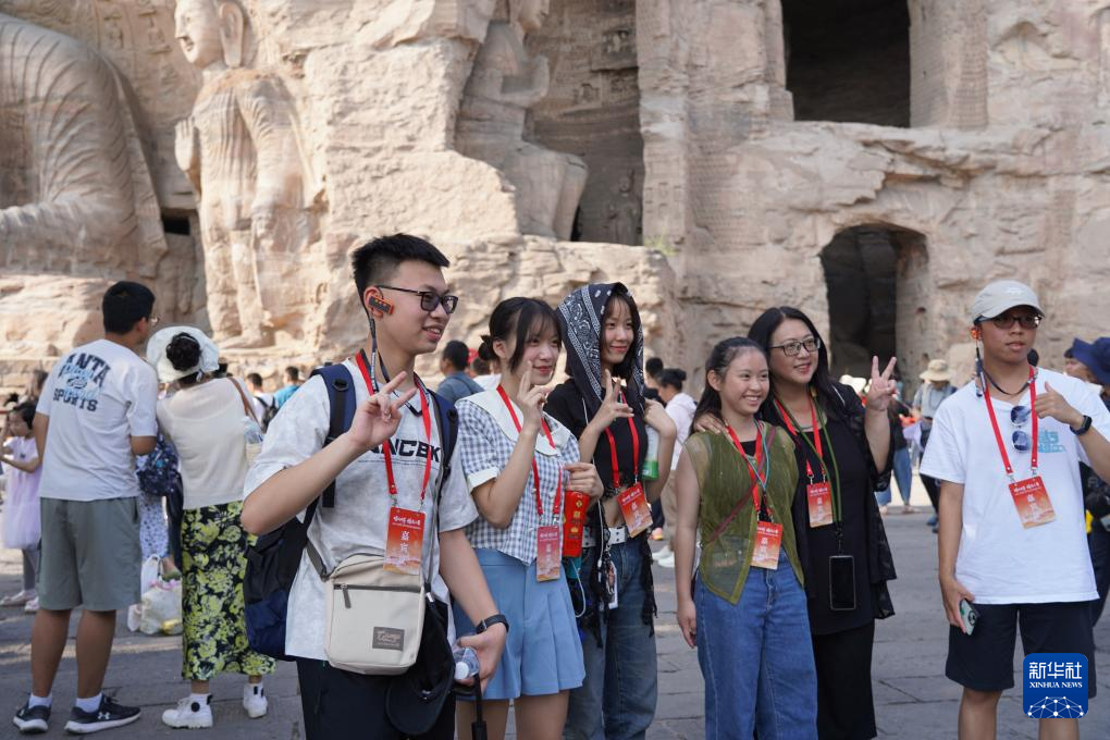 8月13日,来自台湾的青少年在山西大同云冈石窟参观。新华社记者 陈志豪 摄