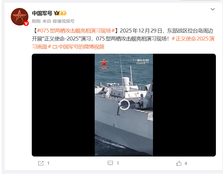 2025年12月29日,东部战区位台岛周边开展“正义使命-2025”演习,075型两栖攻击舰亮相演习现场!