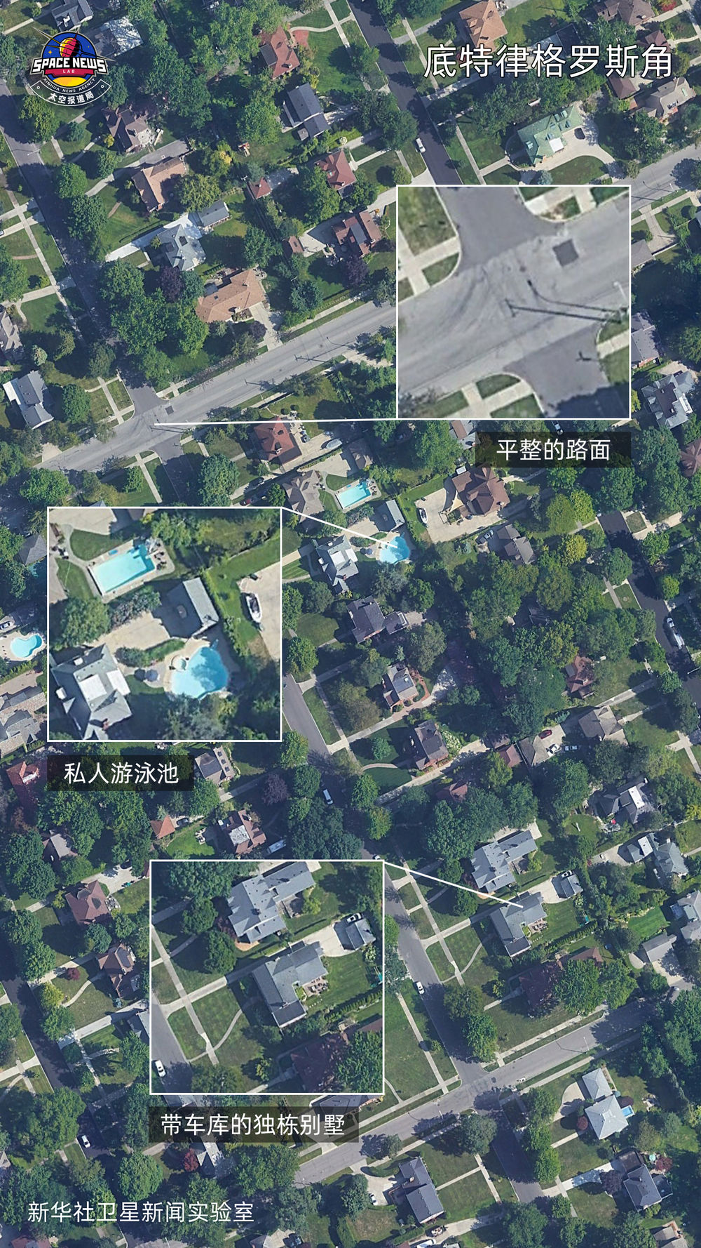 而墙东侧,路面没有明显破损;房屋密度极大,但处处是修剪工整的绿地;单座房屋占地面积一般是西侧的两倍以上,许多房屋有宽阔通道连接马路,说明带有车库;蔚蓝色的游泳池像宝石一般镶嵌在整洁的社区中。