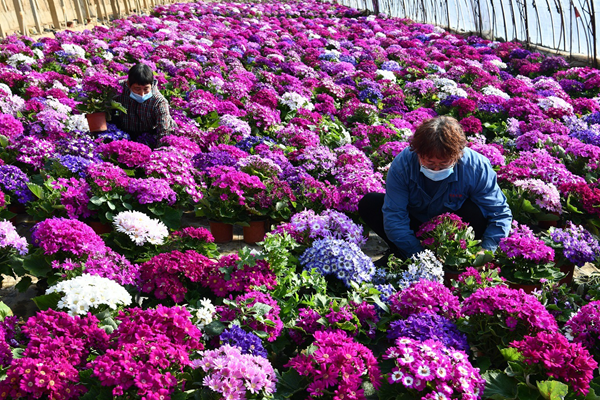 2021年2月2日,石家庄市栾城区柳林太空庄园的花农正在将花卉装袋,准备售卖。李明发 摄