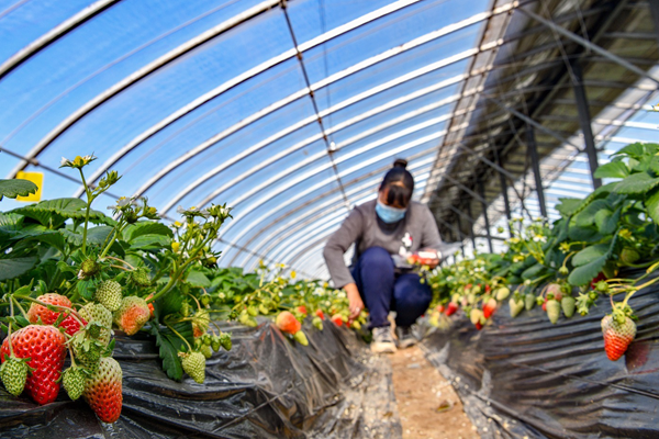 2021年2月2日,石家庄市栾城区神农福地种植专业合作社的农户正在采摘草莓。李明发 摄