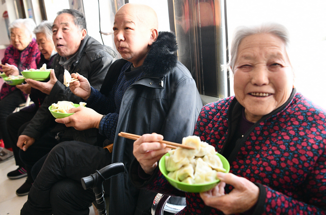 在河北省石家庄市栾城区仁敬养老院,老人们高兴地吃着热腾腾的由爱心人士包的饺子。李明发 摄