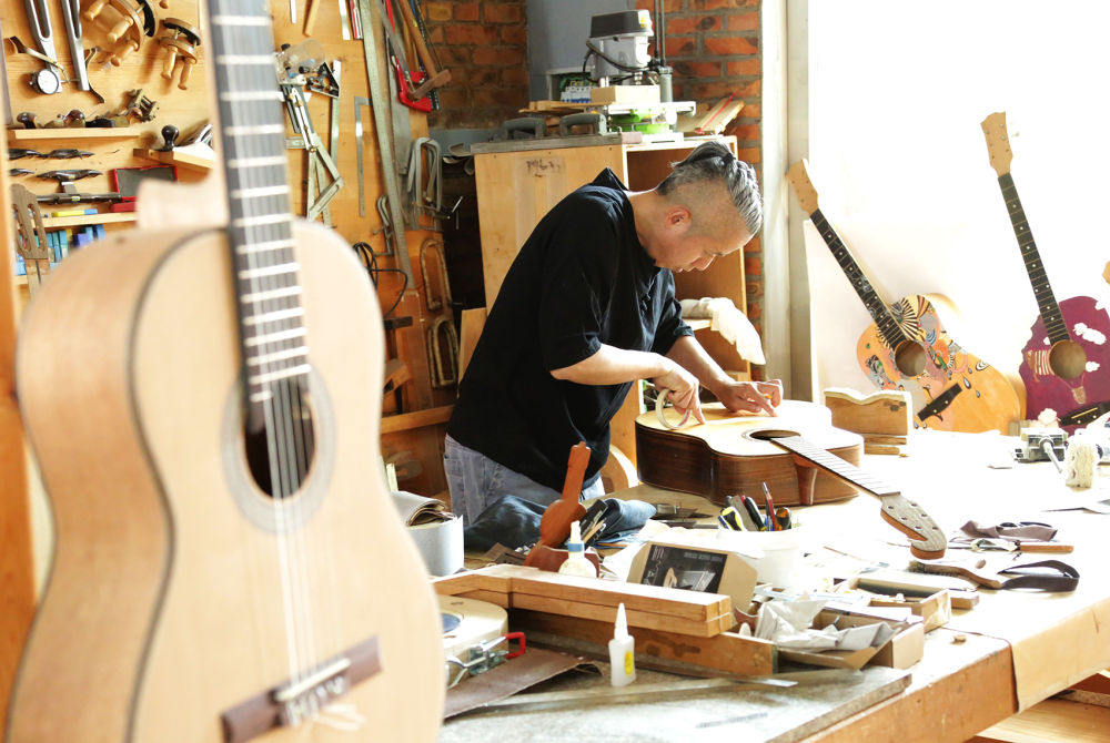 周窝音乐小镇,前身是河北省衡水市武强县周窝村。大家利用住宅“一门一景、一户一品”规划设计,装修改造植入音乐、年画、休闲养生等元素,打造国际级音乐小镇。图为吉他作坊 。新华网发(刘广生 摄于2021年6月8日)
