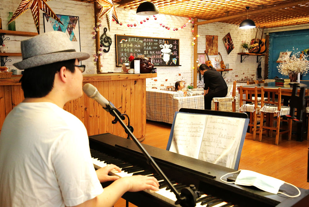 周窝音乐小镇,前身是河北省衡水市武强县周窝村。大家利用住宅“一门一景、一户一品”规划设计,装修改造植入音乐、年画、休闲养生等元素,打造国际级音乐小镇。图为音乐餐厅 。新华网发(刘广生 摄于2021年6月8日)