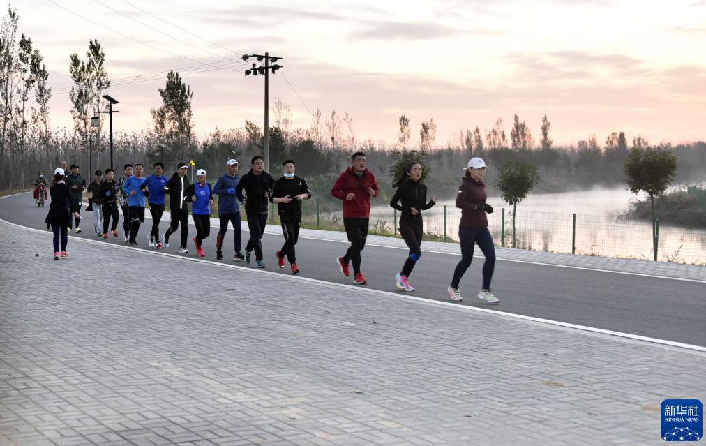 10月23日,市民在泊头市大运河堤顶路上跑步健身。 新华社记者 骆学峰 摄
