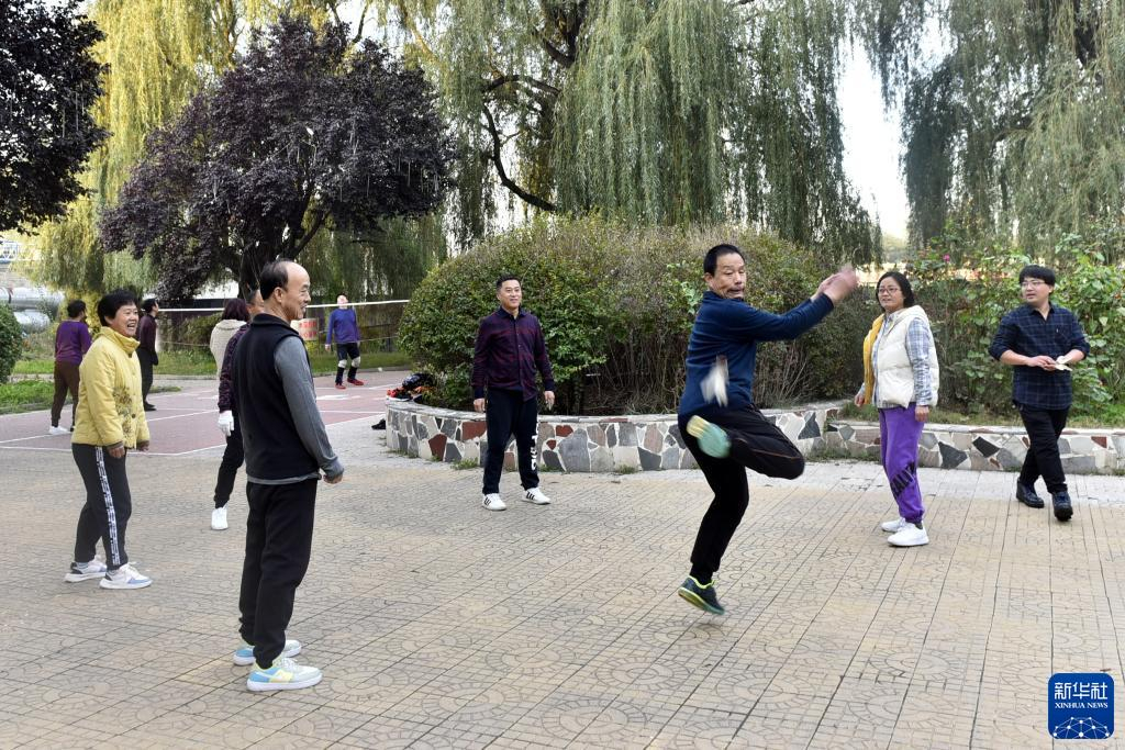 10月23日,市民在泊头市大运河生态公园踢毽子。新华社记者 骆学峰 摄