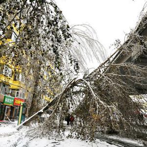 暴雪后期转为冻雨及雨夹雪。在哈尔滨市多处街道旁,记者看到大大小小的树木上形成厚厚的冰挂,许多树木折断、倒塌,有的横在路中间阻碍交通,有的砸向停在路边的车辆,有的则砸到变压器及电线上,造成局部断电。