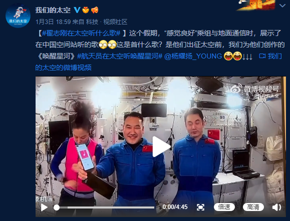 【翟志刚在太空听什么歌 】这个假期,“感觉良好”乘组与地面通信时,展示了在中国空间站听的歌。这是首什么歌?是他们出征太空前,我们为他们创作的《唤醒星河》。