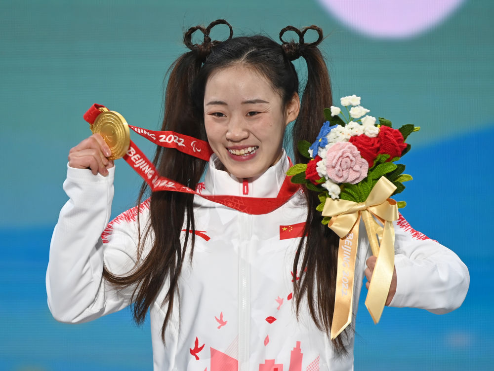 3月6日,北京2022年冬残奥会残奥高山滑雪女子超级大回转(站姿)比赛中获得金牌的中国选手张梦秋在颁奖仪式上。新华社记者李嘉南摄