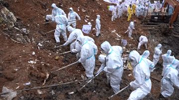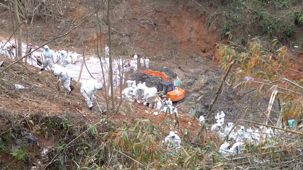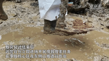 默哀仪式结束后,武警官兵立即进场开展搜救搜索任务,在事故核心区及东侧山坡进行作业。