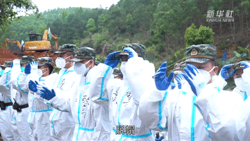 在进入搜救搜索任务核心区之前,武警官兵在核心区外围举行默哀仪式。