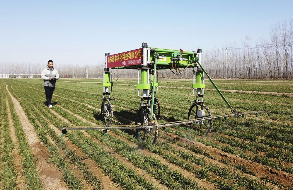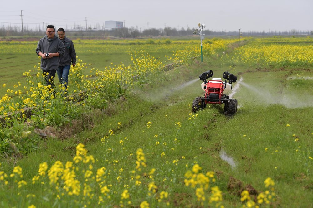 山东省邹平市粮食提质增效关键技术攻关项目明集镇解家村基地,农民操作植保机器人管护麦田 (新华社发 董乃德 摄)