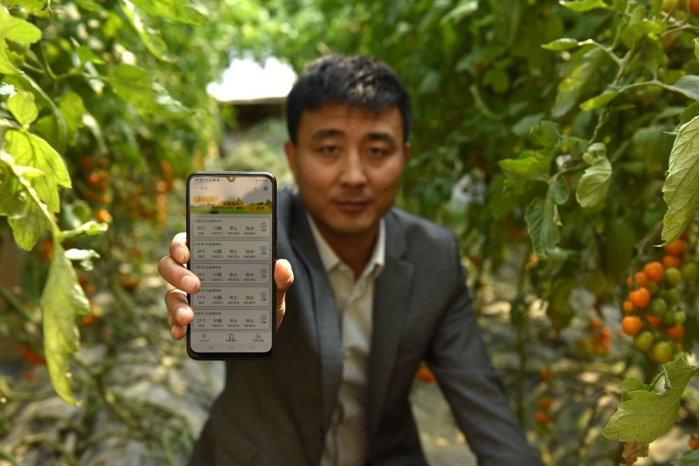4月6日,种植户在河北沧州泊头市齐桥镇李楼村温室大棚内展示温室大棚智能控制系统。(新华社发 苑立伟 摄)