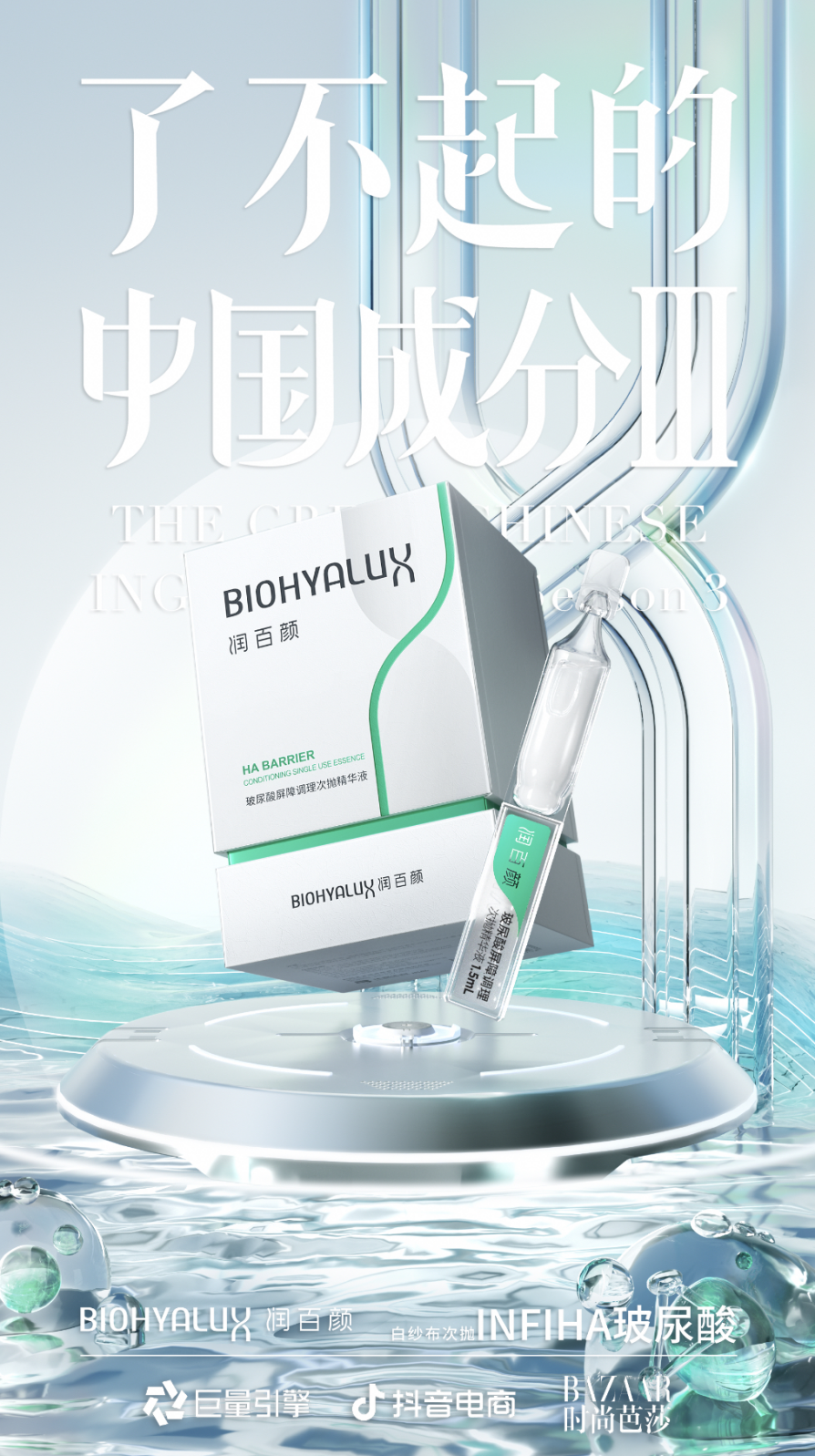 5月22日,“了不起的中国成分”第3季在备受期待中正式发布,新一季IP由巨量引擎联动抖音电商,品牌阵容也再度焕新,联袂润百颜、瑷尔博士、欧诗漫、韩束、丸美与WIS六大品牌,并三度携手顶级时尚媒体《时尚芭莎》深度合作。新华网参与联合宣发,同时百家影响力媒体集体发声助力;活动还邀请到抖音头部明星主播@贾乃亮、头部美妆博主@陈采尼 和 @勇仔leo、高人气达人@天才小火龙 展开共创,以及时尚、颜值、护肤专业领域等跨圈层达人共同参与挑战赛互动和内容种草,系列品牌专场直播活动纷至而来,助力品牌力提升加速营销转化,每一个亮点都带来全新惊喜。