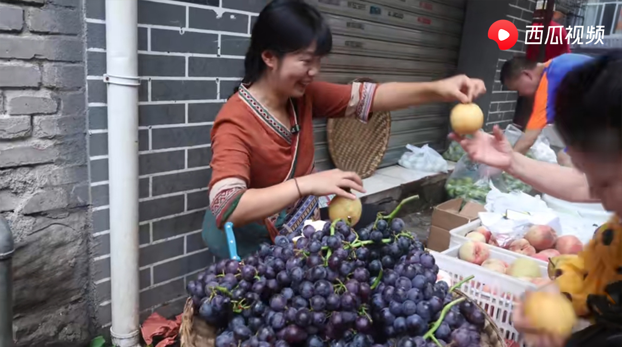 2022年初,燕麦回到家乡后就开始用西瓜视频记录自己的乡村生活,在西瓜视频账号@燕麦行游上偶然发布的一条“背菜进城摆摊卖货”的视频,获得了近30万次观看,而这,让她发现了一个独特的助农方式。
