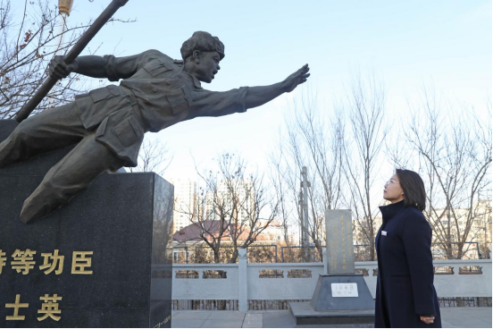 2021年2月2日,梁士英烈士的孙女梁丹丹在梁士英舍身炸地堡遗址瞻仰爷爷雕像。新华社记者 杨青 摄