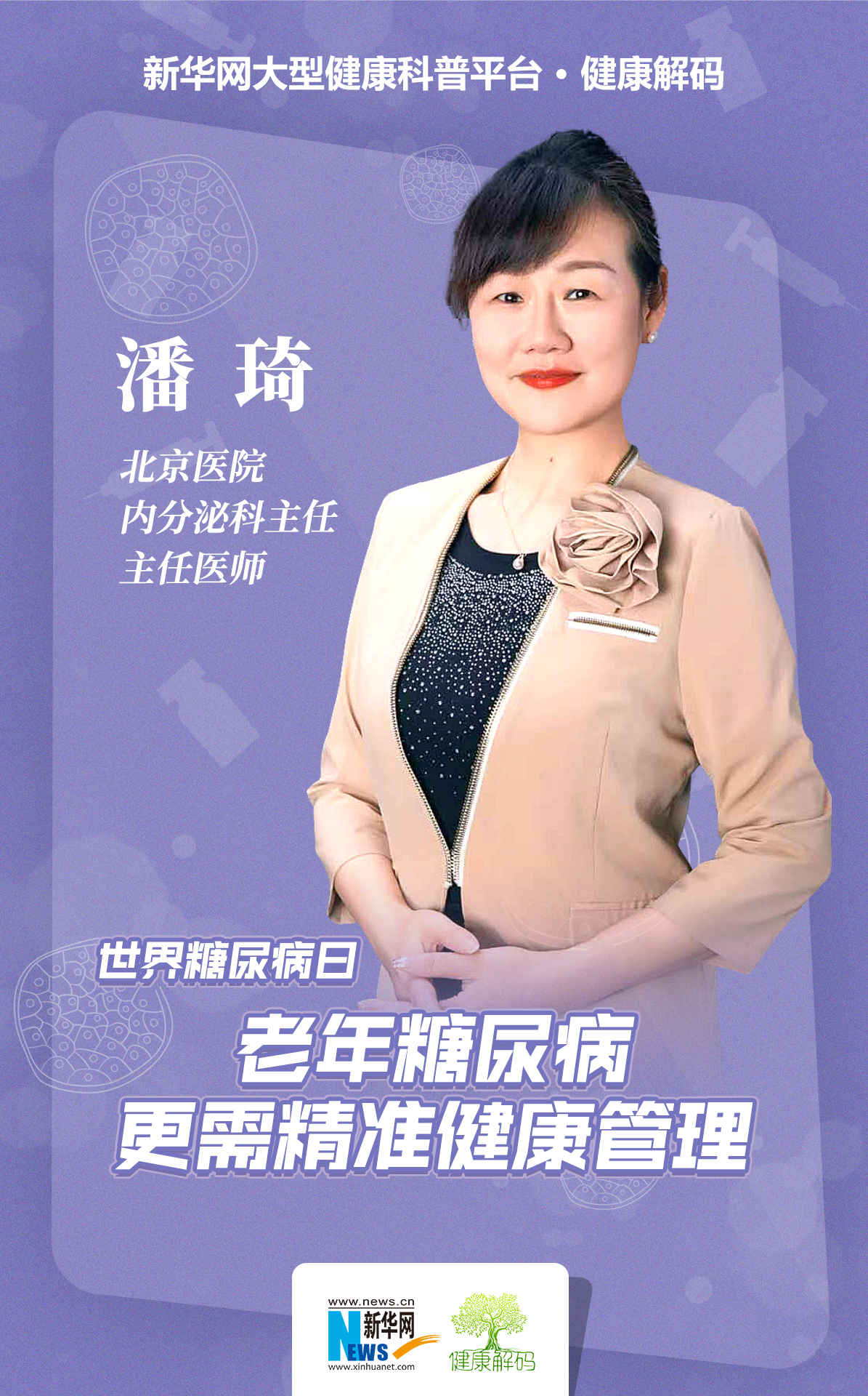 潘琦:多数老年患者并没有明显的“三多一少”症状(烦渴多饮、多尿、多食、不明原因体重下降)。相比其他年龄段的糖尿病患者,老年患者慢性并发症多,伴发症常见,易发生低血糖且对低血糖耐受差。随着年龄增长,老年患者的视力、认知能力、行动能力发生不同程度的下降,甚至发生“老年综合征”,包括同时使用多种药物、认知障碍、尿失禁、跌倒、持续性疼痛等。此外,在生活方式上,营养不良、餐后血糖升高在老年患者中很常见。