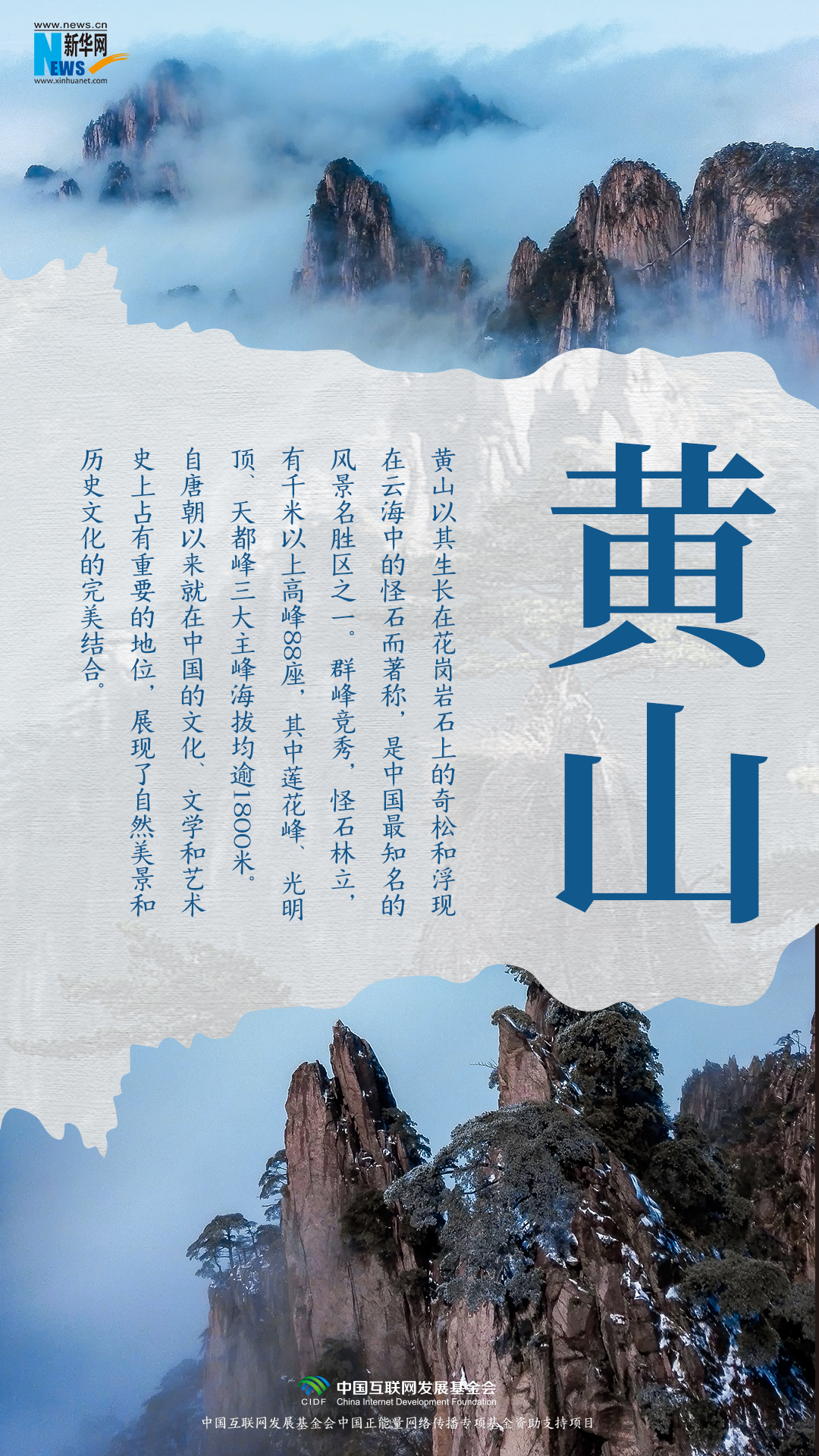 黄山位于安徽省南部,以奇松、怪石、云海、温泉、冬雪“五绝”及画派、石刻、古道、文学、名人“五胜”闻名于世。素有“五岳归来不看山,黄山归来不看岳”之美誉,其境内峰峦叠嶂,巧石林立,青松争奇,烟云万象,形成了曼妙奇绝的自然景观。作为中国的传统名山,黄山承载了深厚的历史文化内涵,拥有古建筑、古蹬道、摩崖石刻等,并孕育了中国山水画“黄山画派”。