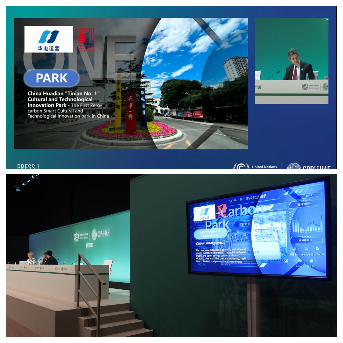 图片1:COP28联合国官方新闻发布会上,华电运营向世界展示碳中和优秀案例。