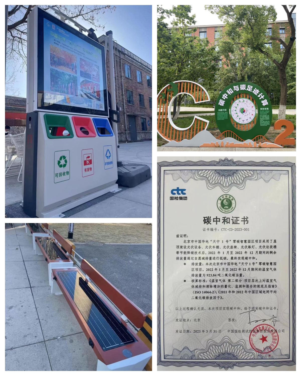 图片4:“天宁1号”零碳智慧园区内,华电低碳宣传语、光伏座椅等景观和“天宁1号”取得的碳中和认证。