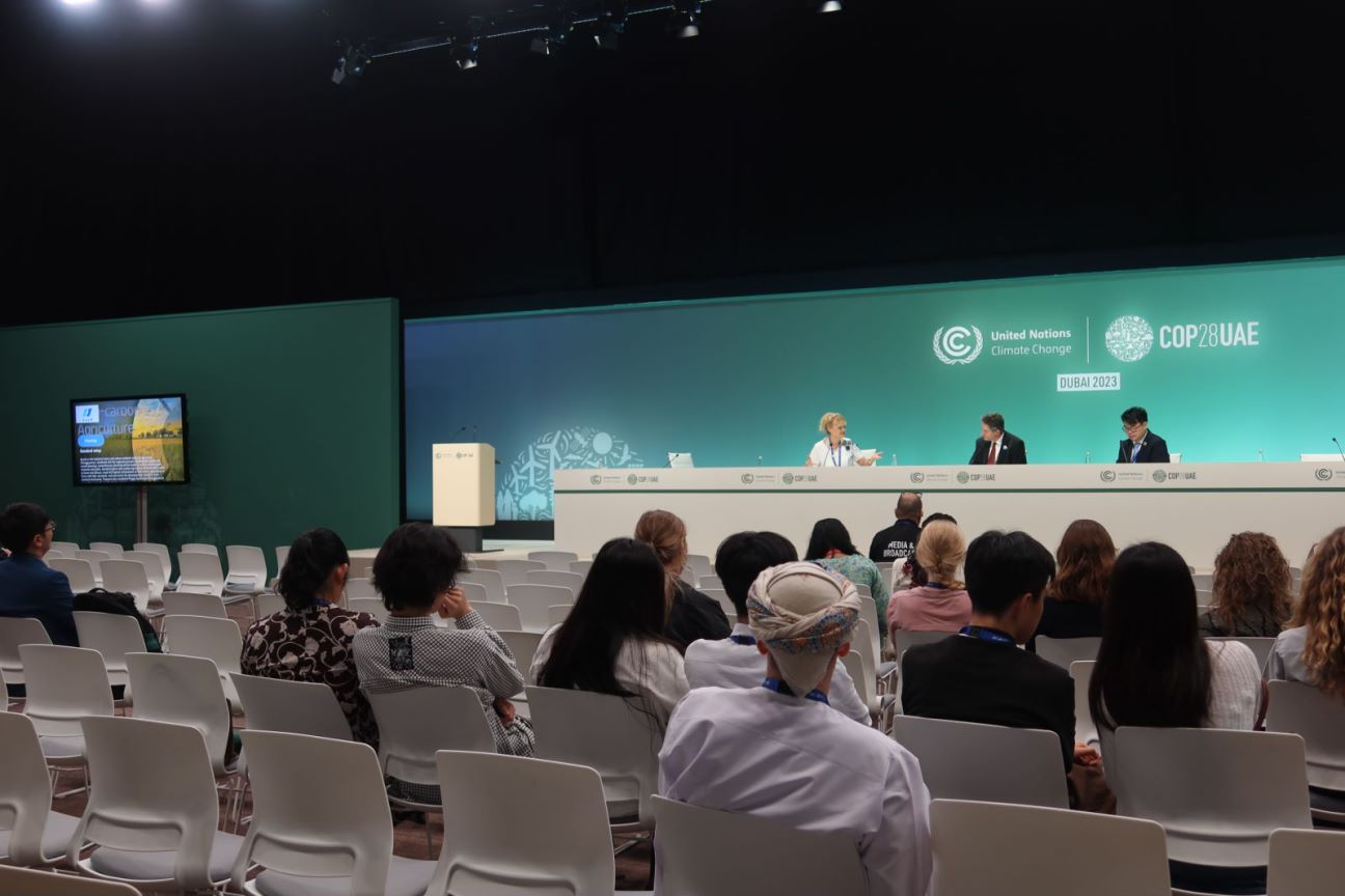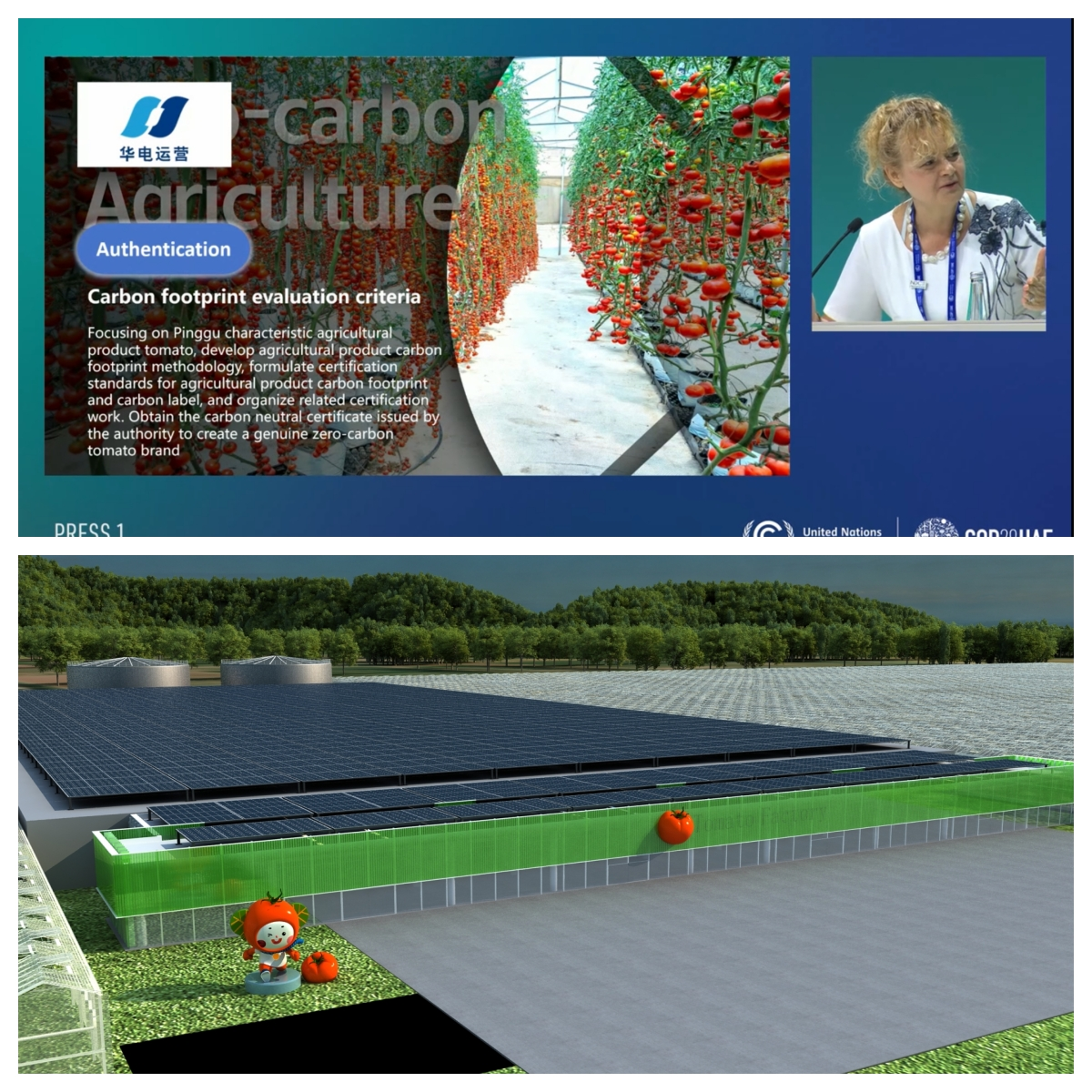 图片3:在COP28联合国官方新闻发布会上,华电运营讲述其为中国华北地区最大的“中国·平谷农业中关村”智能温室提供清洁能源,将碳中和赋能农业生产。