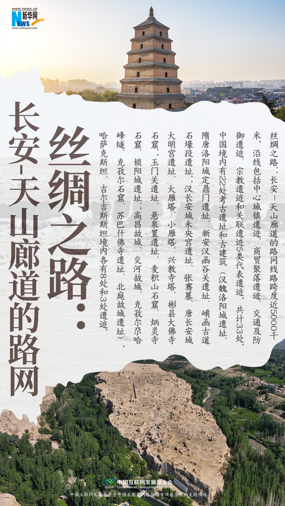 丝绸之路:长安—天山廊道的路网线路跨度近5000千米,沿线包括中心城镇遗迹、商贸聚落遗迹、交通及防御遗迹、宗教遗迹和关联遗迹5类代表遗迹,共计33处,中国境内有22处考古遗址和古建筑(汉魏洛阳城遗址、隋唐洛阳城定鼎门遗址、新安汉函谷关遗址、崤函古道石壕段遗址;汉长安城未央宫遗址、张骞墓、唐长安城大明宫遗址、大雁塔、小雁塔、兴教寺塔、彬县大佛寺石窟;玉门关遗址、悬泉置遗址、麦积山石窟、炳灵寺石窟、锁阳城遗址;高昌故城、交河故城、克孜尔尕哈峰燧、克孜尔石窟、苏巴什佛寺遗址、北庭故城遗址),哈萨克斯坦、吉尔吉斯斯坦境内各有8处和3处遗迹。