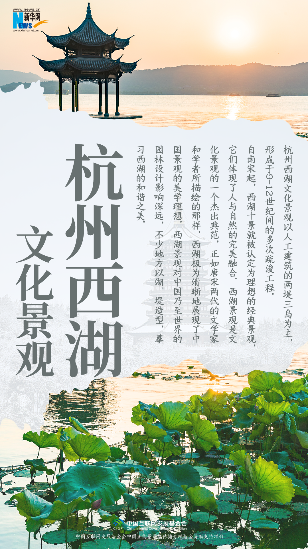 杭州西湖文化景观以人工建筑的两堤三岛为主,形成于9-12世纪间的多次疏浚工程。自南宋起,西湖十景就被认定为理想的经典景观,它们体现了人与自然的完美融合。西湖景观是文化景观的一个杰出典范,正如唐宋两代的文学家和学者所描绘的那样,西湖极为清晰地展现了中国景观的美学理想。西湖景观对中国乃至世界的园林设计影响深远,不少地方以湖、堤造型,摹习西湖的和谐之美。