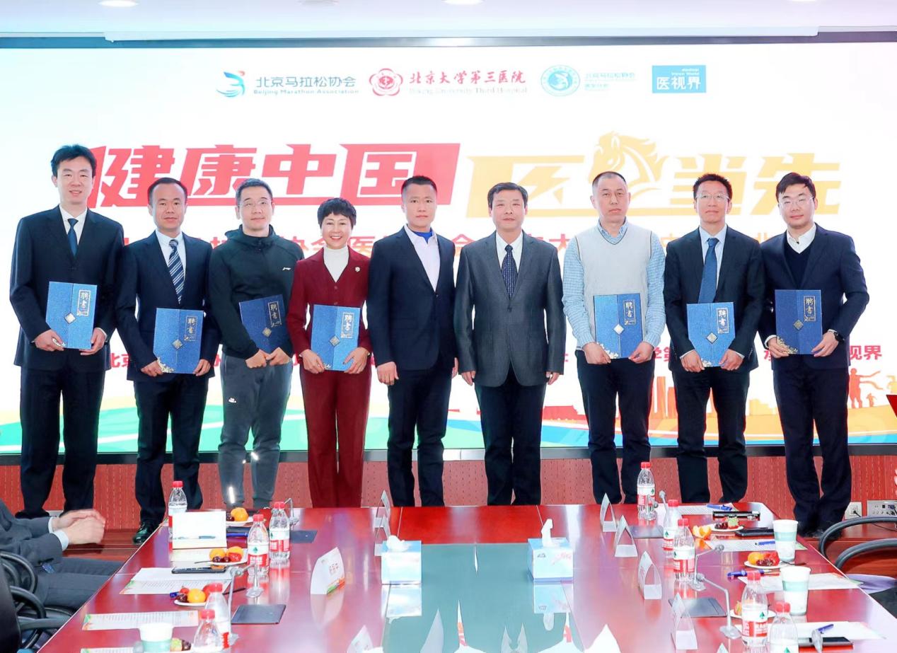 北京马拉松协会医学分会会长付强(左六)为分会任职人员颁发聘书