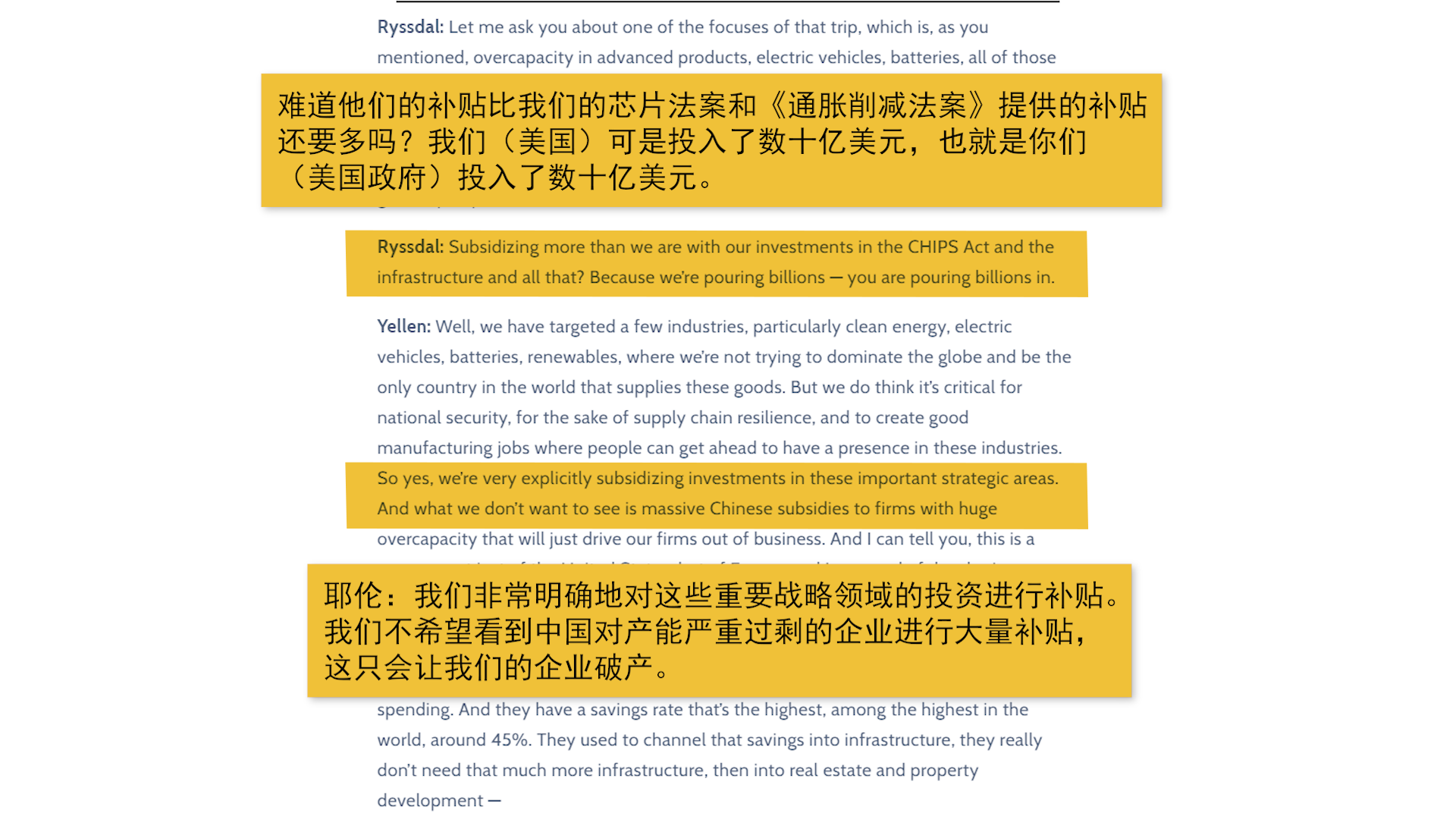 美国把矛头指向中国政府对中国新能源车实施的税收减免和补贴政策。美国财政部长耶伦在接受采访时说到:
