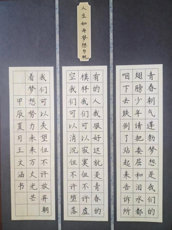 图为来自甘肃的王文涵创作的书法作品《人生如舟 梦想为帆》。