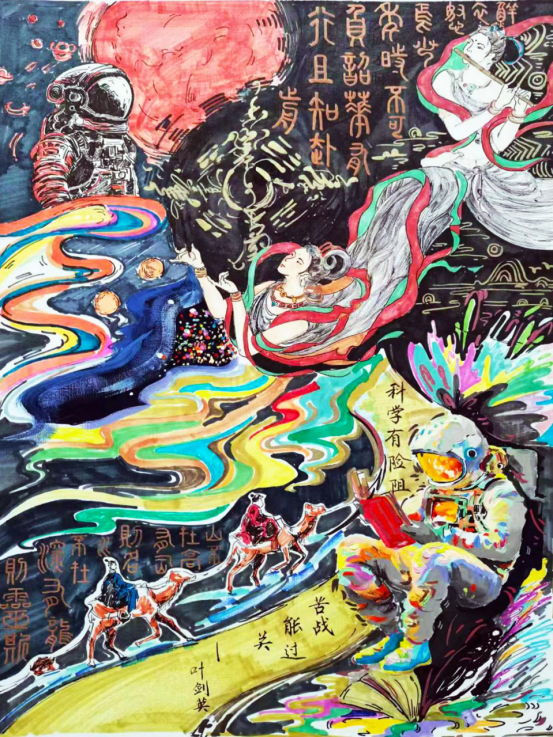 图为来自甘肃的肖雨馨创作的绘画作品《古今飞天梦》。