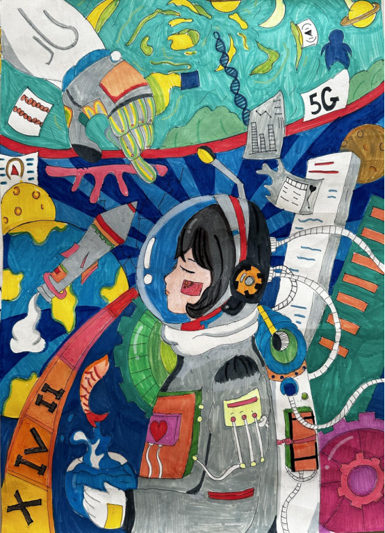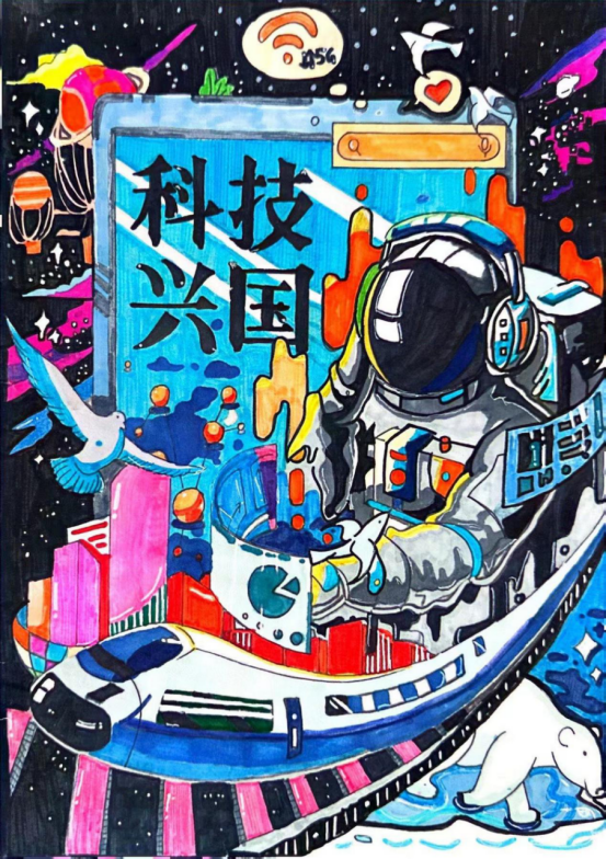 图为来自甘肃的王艺雯创作的绘画作品《科技兴国》。