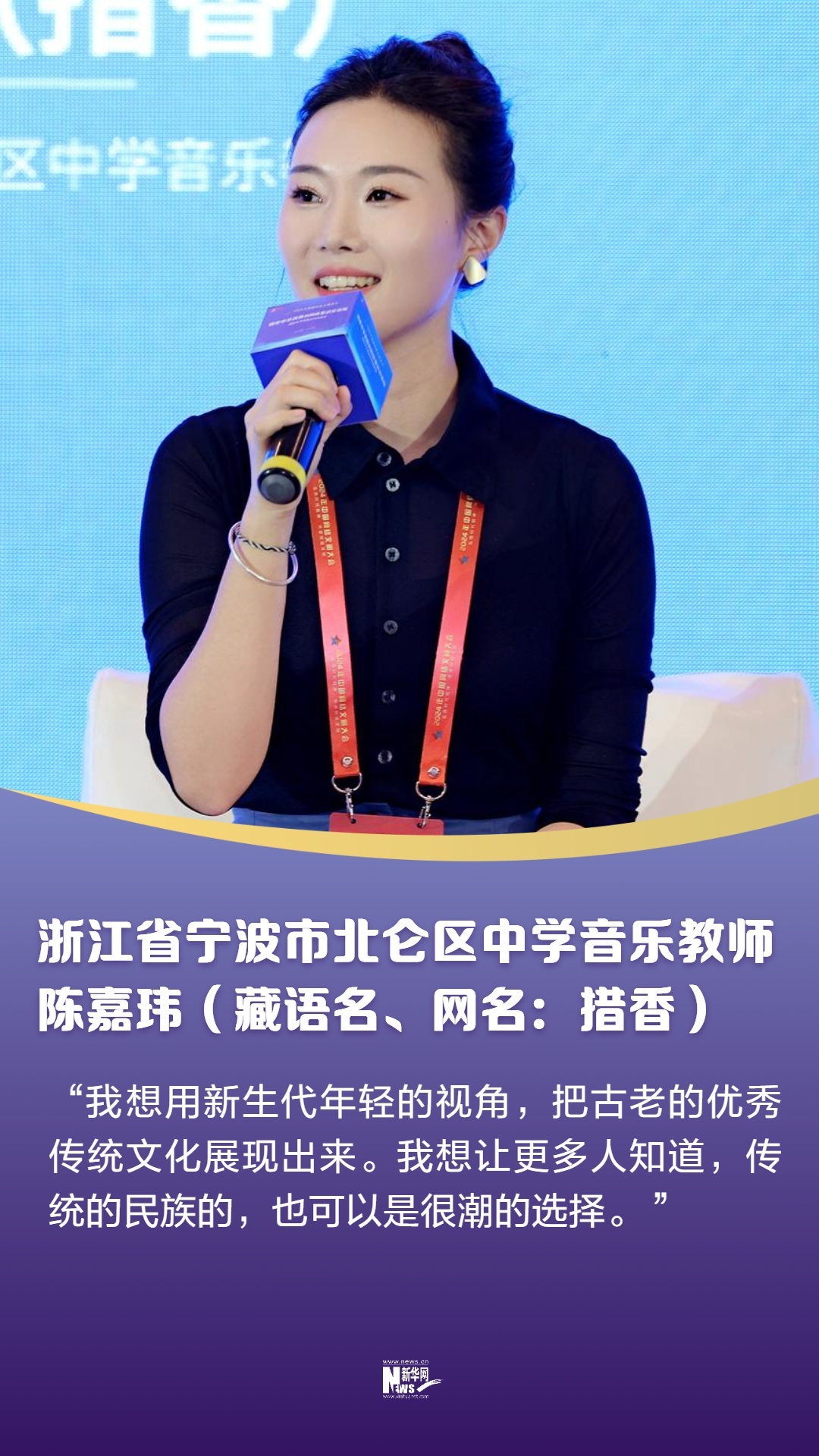 同样因为传统文化走进大家视野的,还有来自浙江省宁波市北仑区中学的音乐教师陈嘉玮。作为一名“95后”的汉族姑娘,她因为弹唱传统藏族音乐赢得了许多人的喜爱,她给自己起了一个好听的藏族名字“措香”。“我想用新生代年轻的视角,把古老的优秀传统文化展现出来。我想让更多人知道,传统的、民族的,也可以是很潮的选择。”她说。