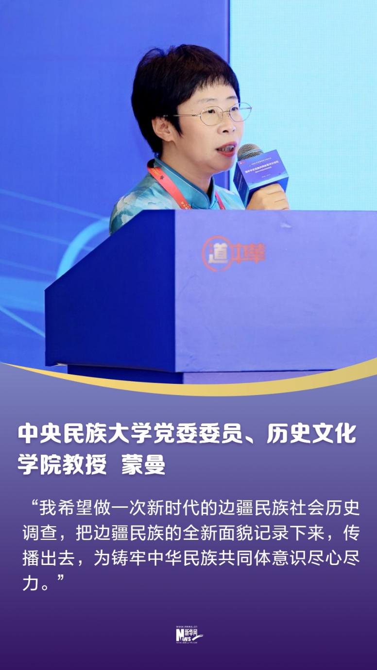 “我希望做一次新时代的边疆民族社会历史调查,把边疆民族的全新面貌记录下来,传播出去,为铸牢中华民族共同体意识尽心尽力。”蒙曼在现场分享了近几个月来用脚步丈量219国道,在追寻“诗和远方”中,感悟文化之美、厚植爱国情怀、筑牢文化自信的心得体会,引得现场掌声阵阵。在行走“国之大道”时,蒙曼通过新媒体平台开设直播,以身临其境的现场感吸引了数百万粉丝。蒙曼说:“我们摆事实、讲故事、做内容,就是想形成一个全民可以参与的互联网时代,能让所有人从中获益,也让所有人为其注入正能量,为营造健康的网络文明贡献力量。”