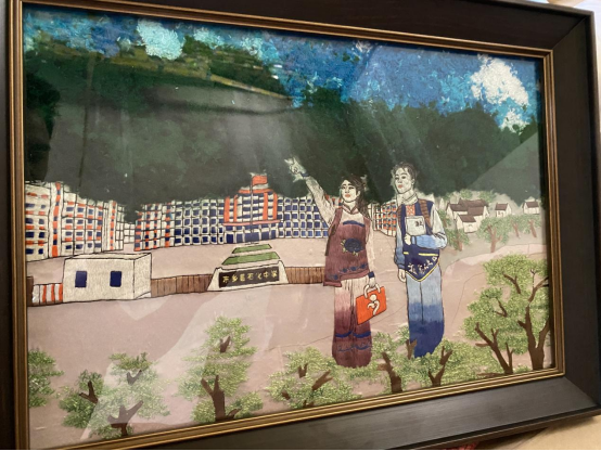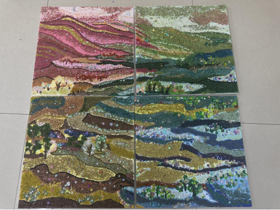 图为来自甘肃的牟小兰、陈雪、马玲珍、马晓轩、陈雪创作的藜麦画《布塄沟的美丽蝶变》。