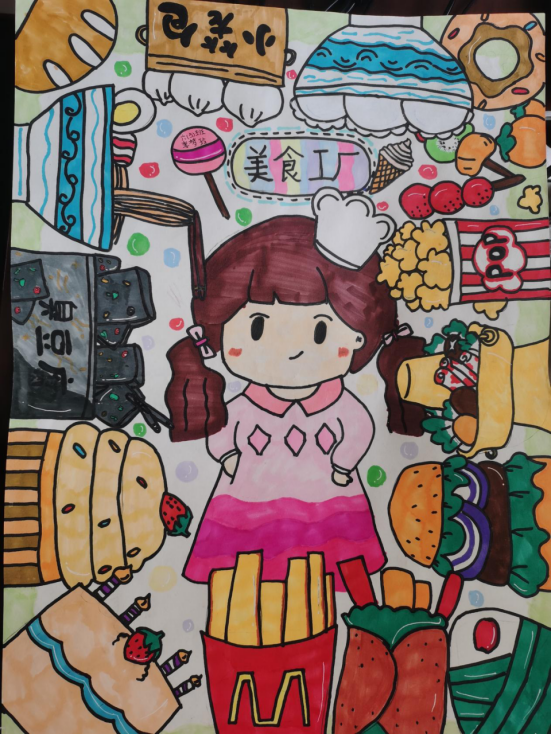 图为来自河南的李梦玲创作的绘画作品《美食工厂》。