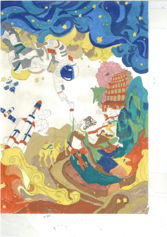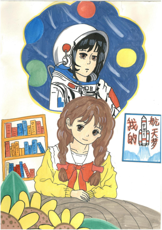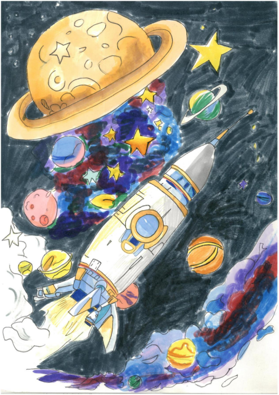 图为来自云南的顾宁珊创作的绘画作品《飞上太空》。