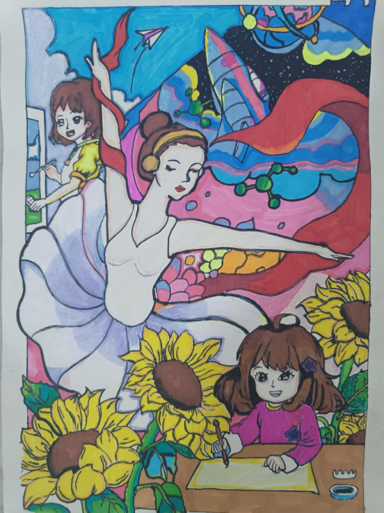 图为来自甘肃的高梓宁创作的绘画作品《航天之梦,繁花颂华》。