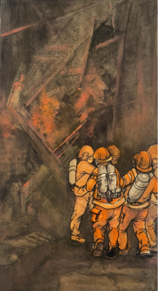 图为来自甘肃的张婷婷创作的绘画作品《烈火英雄》。