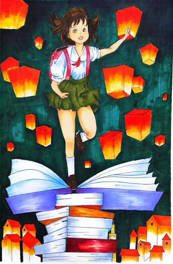 图为来自云南的罗睿祺创作的绘画作品《书海梦灯》。
