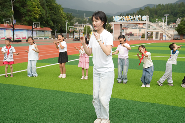 7月28日,贵州省盘州市沙陀小学的操场上,大学生志愿者正在教孩子们跳舞。新华网章佳礼 摄