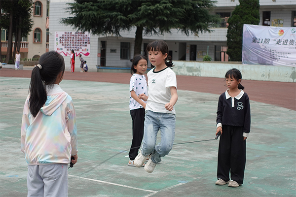 7月27日,贵州省纳雍县维新镇第二小学的孩子们在操场上跳绳。新华网吴咏玲 摄