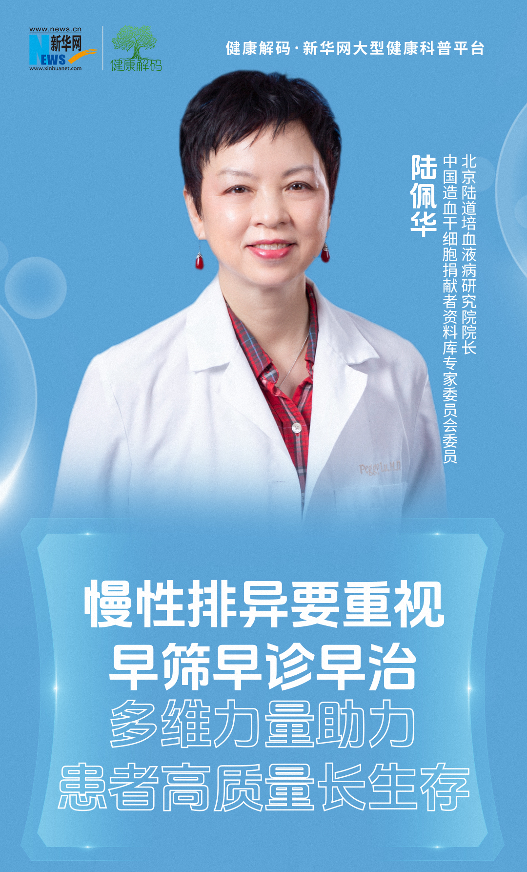 陆佩华:异基因造血干细胞移植是治疗血液系统疾病的重要手段之一,我们国家异基因造血干细胞移植每年大概增长率在10%左右。就我们医疗集团而言,我们目前下设的血液病相关的科室就有二十九个科室。这些年来,我们不仅在临床的医学上积累了大量经验,在科研方面也努力地创造条件,开展各种各样的临床试验,为我们广大病人提供优质的服务。