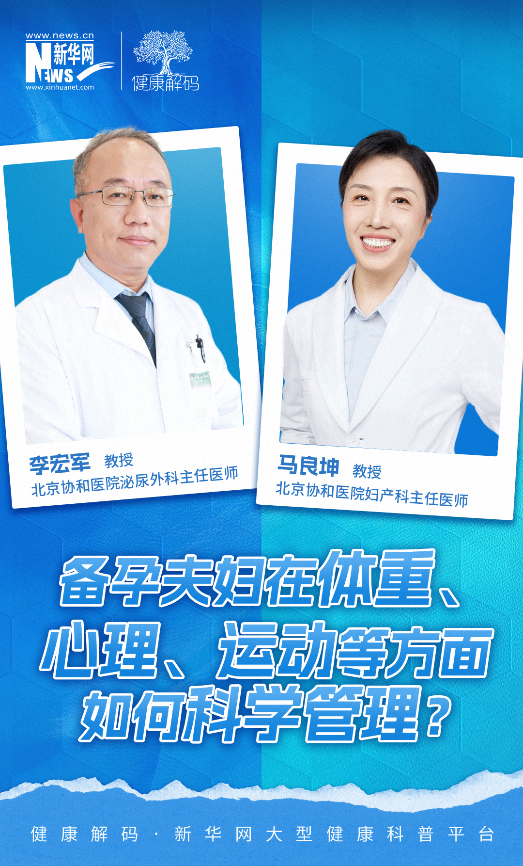 本集节目我们邀请了北京协和医院妇产科主任医师马良坤教授、北京协和医院泌尿外科主任医师李宏军教授共同分享《备孕夫妇在体重、心理、运动等方面如何科学管理?(下)》。