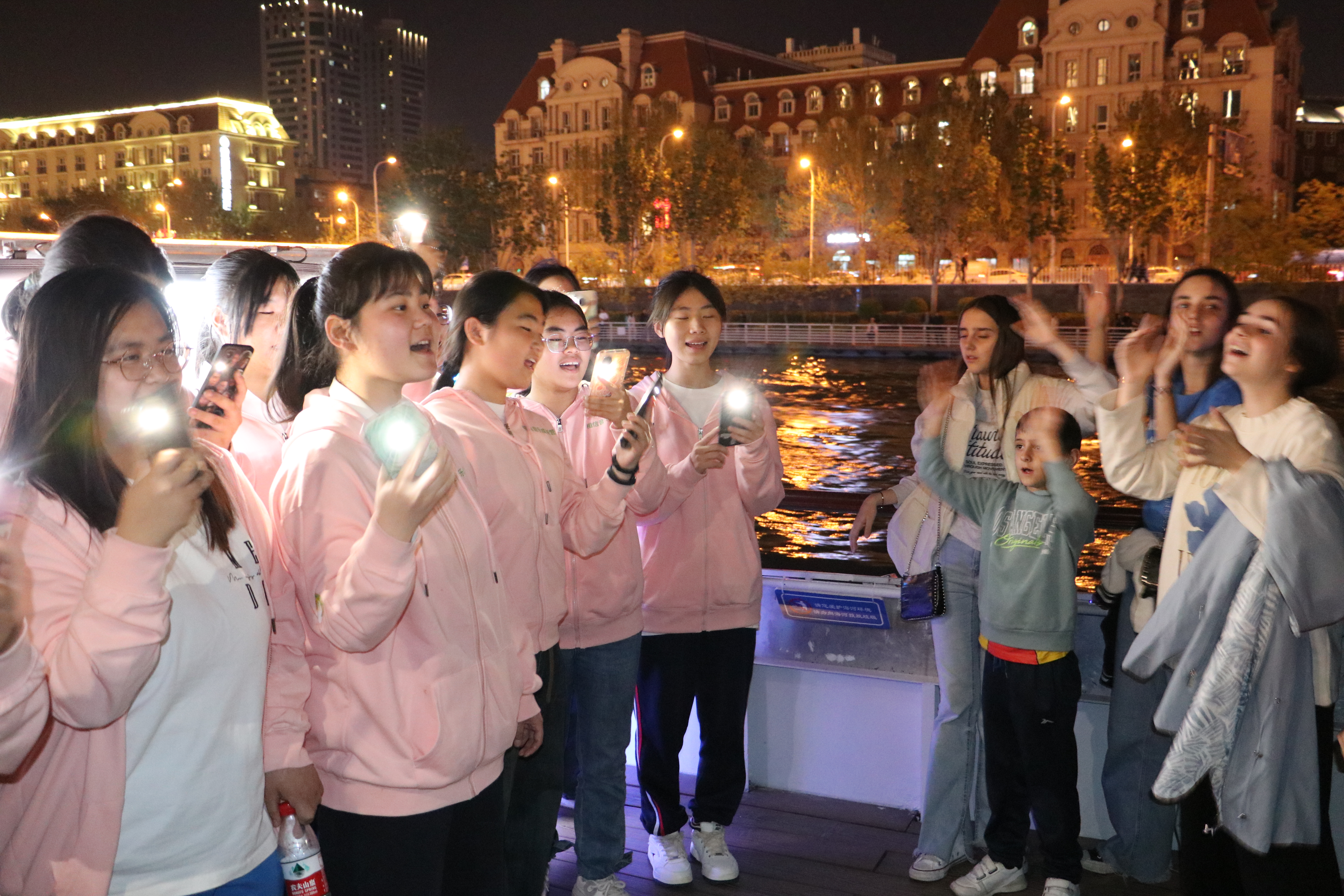“当我和世界不一样,那就让我不一样,坚持对我来说就是以刚克刚……”观景甲板上,同学们情不自禁地唱起五月天的歌曲《倔强》,这一幕吸引了同行的中外游客朋友。大家轻声地附和着,晃动的手机闪光灯与两岸的灯火交相辉映,格外美丽。