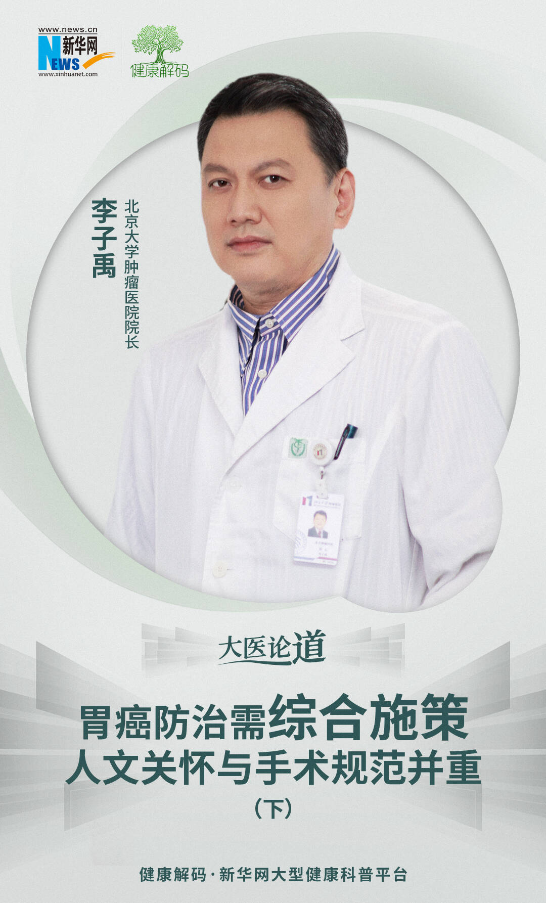 北京大学肿瘤医院院长、党委副书记、胃肠肿瘤中心主任医师、中国抗癌协会副理事长李子禹做客新华网《大医论道》栏目