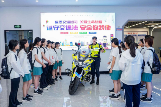 7月10日,厦门市交警支队机动大队的女骑警为参加“春蕾茁壮公益计划”研学营的春蕾女孩们讲授交通安全知识。